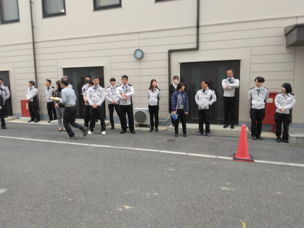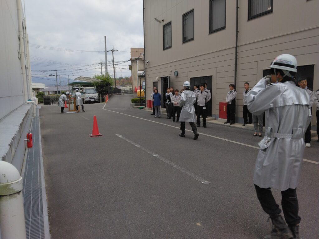 消防訓練では、避難訓練を実施した後、河内長野ガス自衛消防隊による屋内消火栓・消火器競技のデモンストレーションを行いました。 消防訓練を通じて、従業員が火災時に迅速かつ的確な対応ができるようにして参ります。